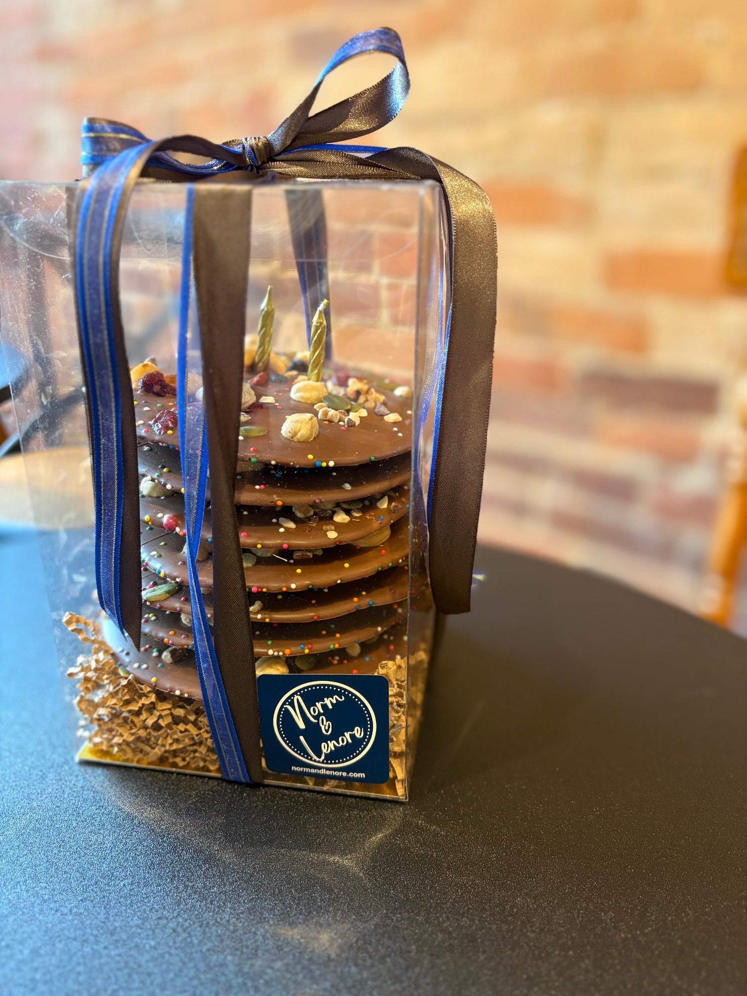 Our Chocolate Celebration “Cake” is a delicious twist on the traditional birthday dessert. Instead of sponge and icing, it features rich layers of handcrafted chocolate stacked into a cake shape and topped with colourful sprinkles, dried fruits, crunchy nuts, and festive birthday candles. Part gift and part show-stopping treat, it’s the perfect choice for chocolate lovers who want to celebrate in a uniquely sweet way.