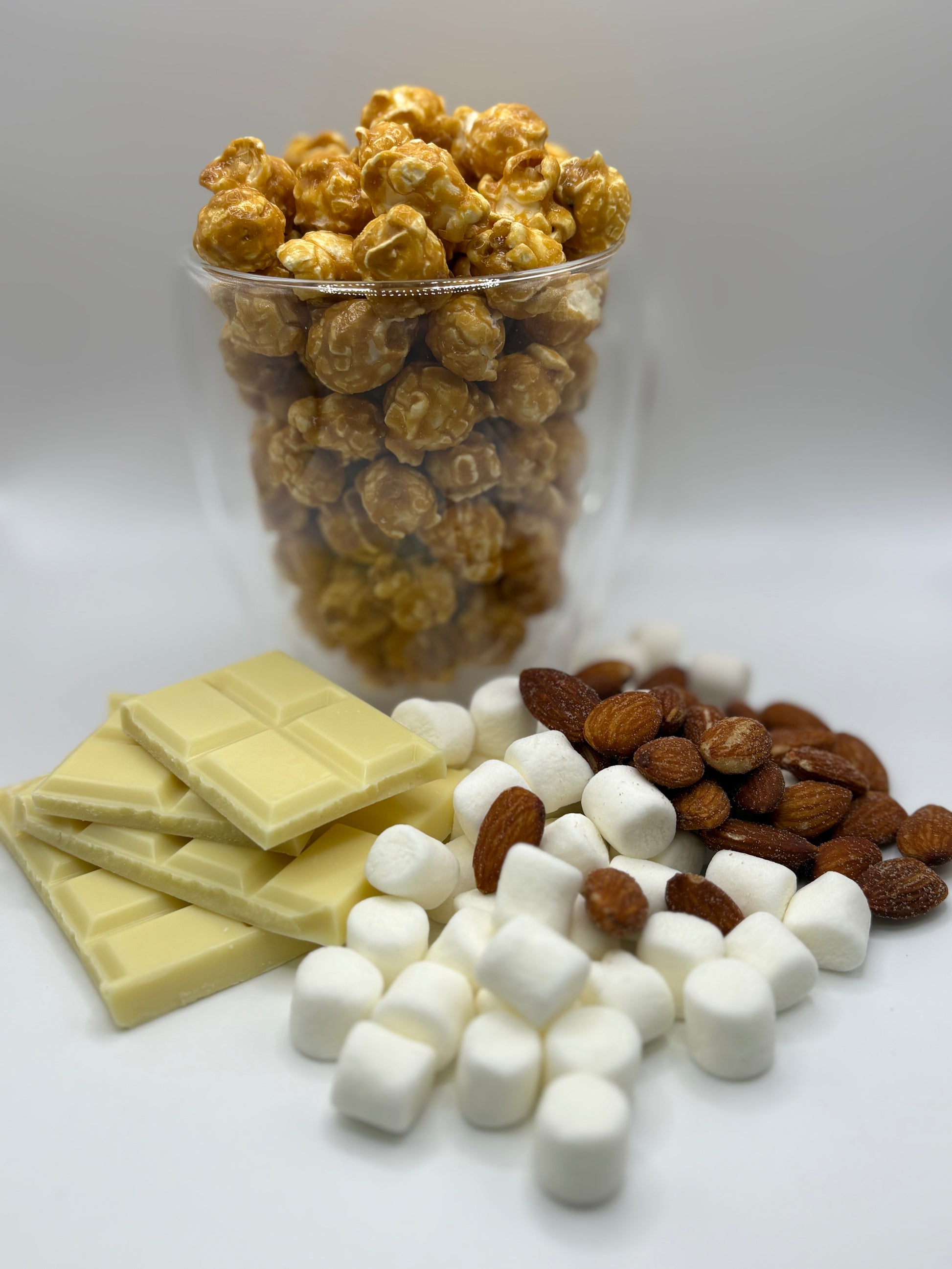 Popcorn, Sugars, Cocoa Butter, Chocolate Liquor, Soya margarine, Modified Corn Starch, Pork Gelatin, Water, Natural Flavour, Tetrasodium Pyrophosphate, Almonds, Coconut Oil, Salt, and Vanillin.