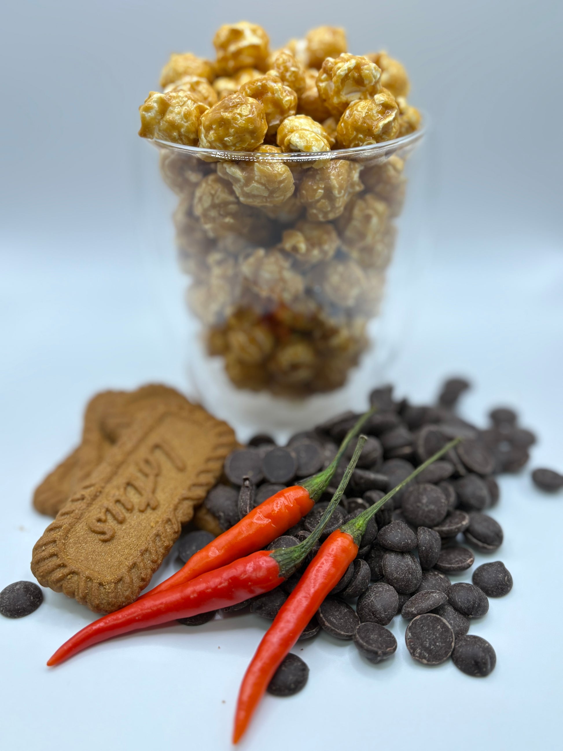 Popcorn, Sugars, Hydrogenated Vegetable Oils, Enriched Wheat Flour, Sugar, Canola and Palm Kernel Oil Shortening, Cocoa Solids, Milk Solids, Water, Ginger, Ammonium Bicarbonate, Baking Soda, Monocalcium Phosphate, Citric Acid, Emulsifier, Butter, Natural and Artificial Flavours, Soy Lecithin, Chili Powder, Iodized Salt, Dicalcium Phosphate.