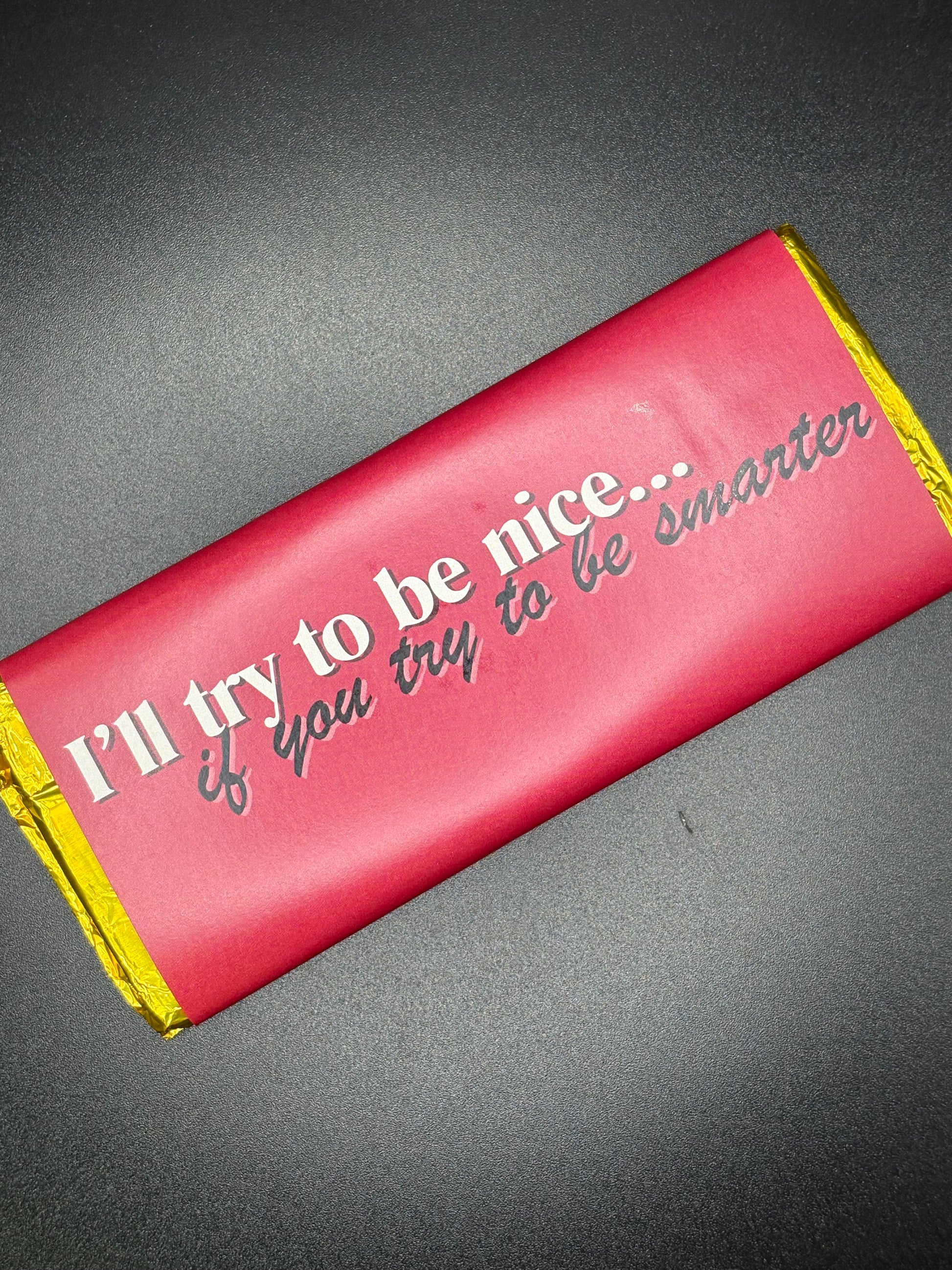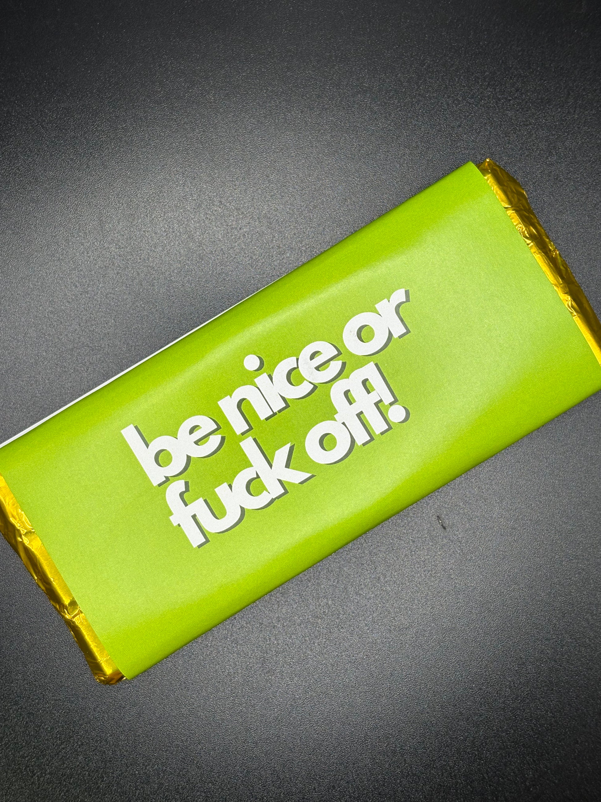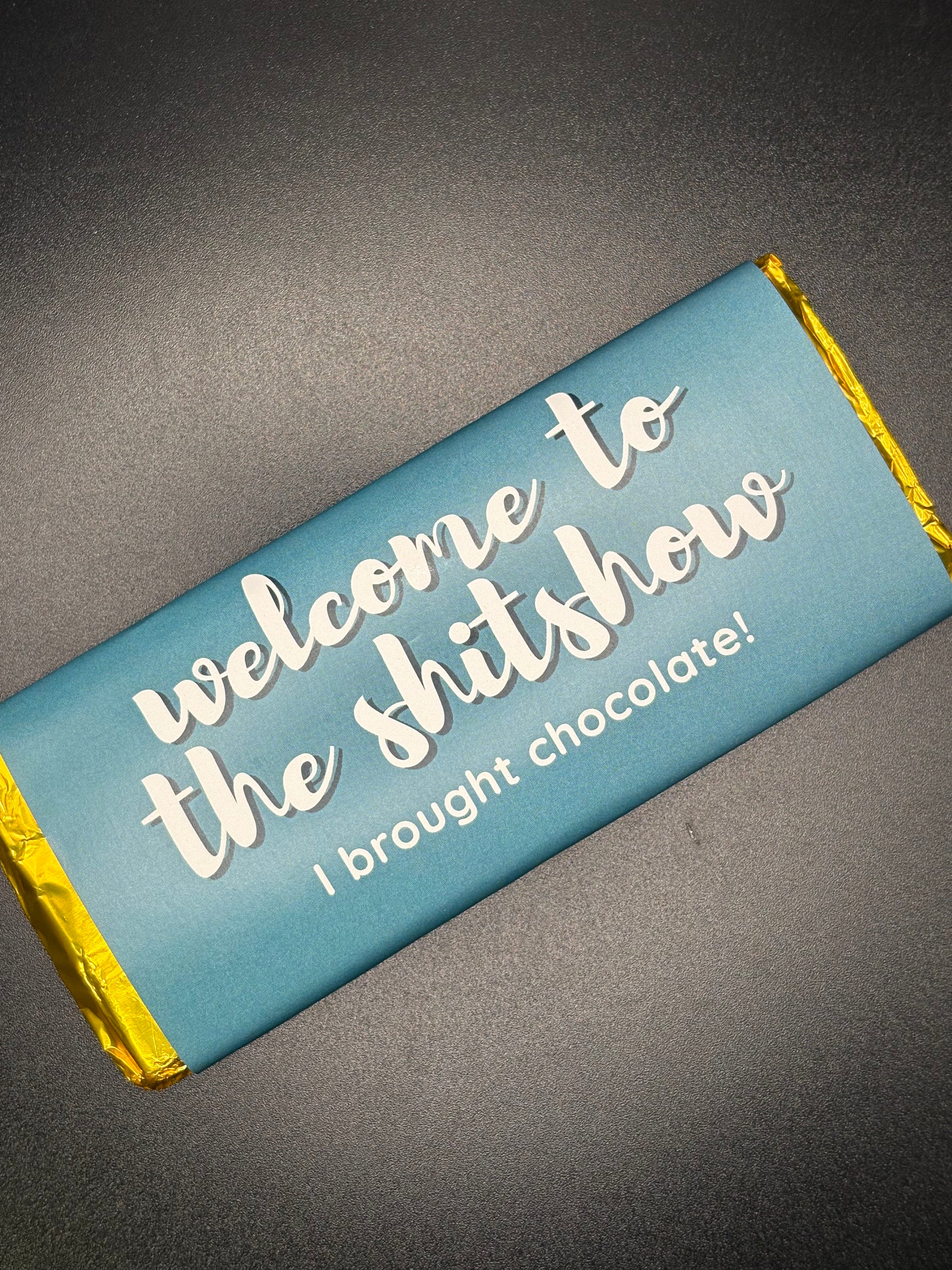 Indulge in some cheeky chocolate with our Foil Wrapped Cheeky Chocolate Bar. With fun sayings like "be nice or f@*k off" and "Welcome to the shit show, I brought chocolate", you'll be snacking with a smile. Treat yourself or give as a gift for a playful and delicious surprise!